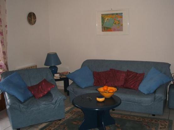 Wohnraum mit Schlafsofa, 2 Sessel, Esstisch, SAT-TV Flachbild 40" France, deutsch